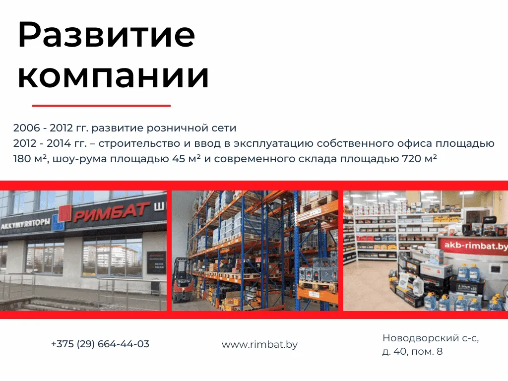Сегодня РИМБАТ - это торговая сеть из 16 розничных магазинов и 3 интернет-ресурсов по продаже аккумуляторов, команда из 75 человек, в которой каждый – эксперт в своей области