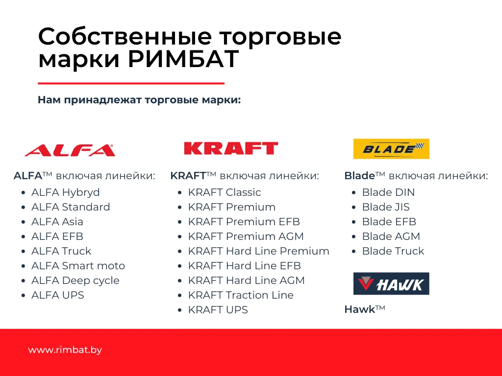 Продуктовый портфель РИМБАТ включает аккумуляторные батареи для всех видов транспорта и спецтехники: от классических свинцово-кислотных АКБ для легковых и грузовых авто до инновационных AGM/GEL-решений для автомобилей с системой Start-Stop, а также специализированные линейки для сельхозтехники, погрузчиков и промышленного оборудования.