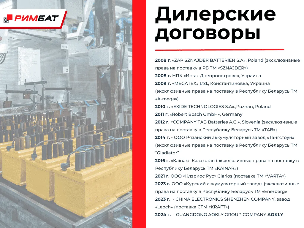 РИМБАТ - это прямой поставщик аккумуляторных батарей для автомобилей, сельскохозяйственной и промышленной техники. С момента основания компании мы стремимся к постоянному развитию и улучшению нашего ассортимента.